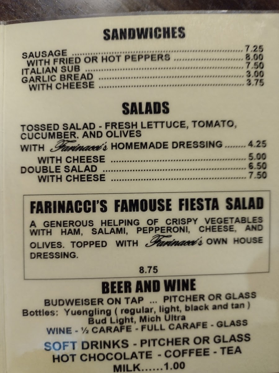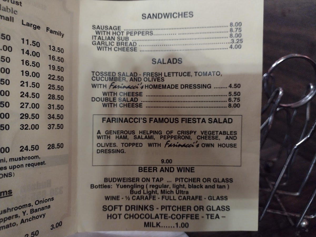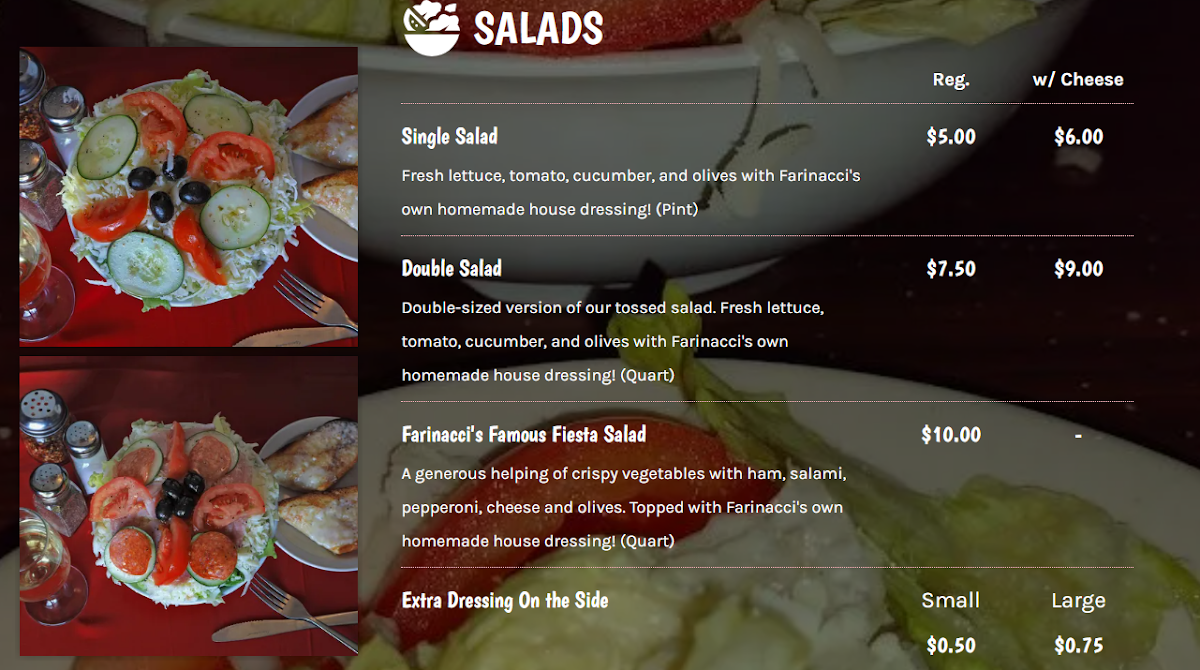 - Salads: Fresh options are available, with highlights like the Farinacci's Famo Fiesta.